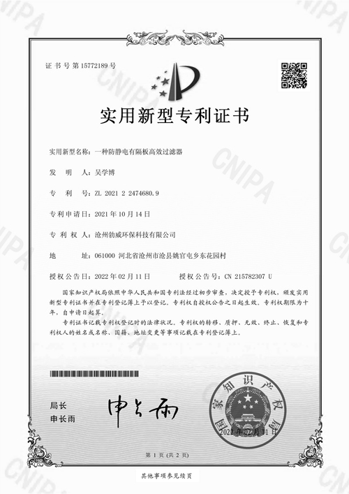 公司已通過ISO 9001質量管理體系認證。空氣過濾器系列產品已通過國家專業機構質量檢驗檢測認證。公司擁有初中效空氣過濾器性能測試臺,高效過濾器掃描檢測臺,濾料性能檢測臺等技術領先的檢測設備,并建立了“空氣過濾設備技術研發中心”。公司擁有十萬級標準化潔凈生產車間600㎡,空氣過濾器年產能可達100萬套以上。